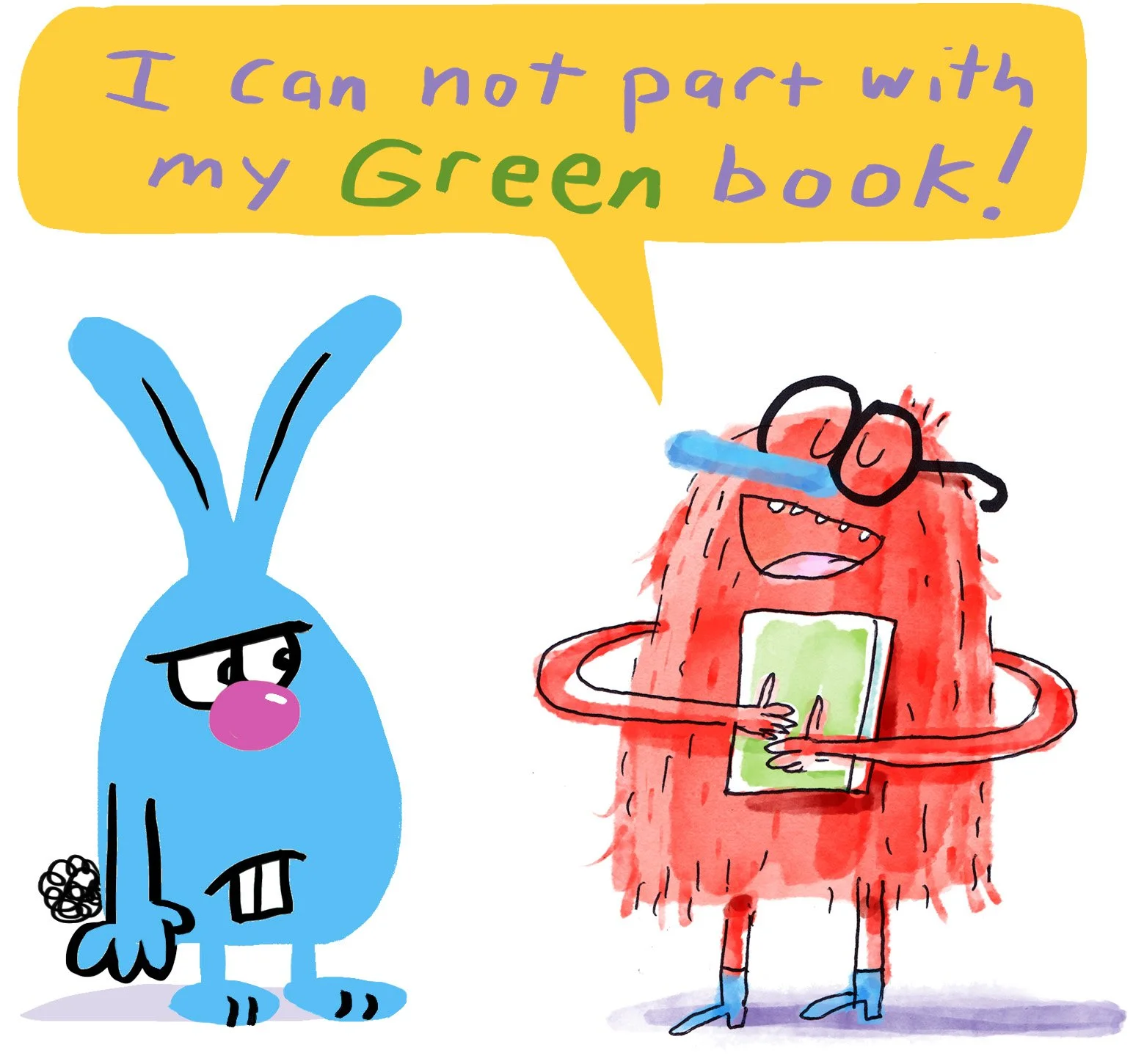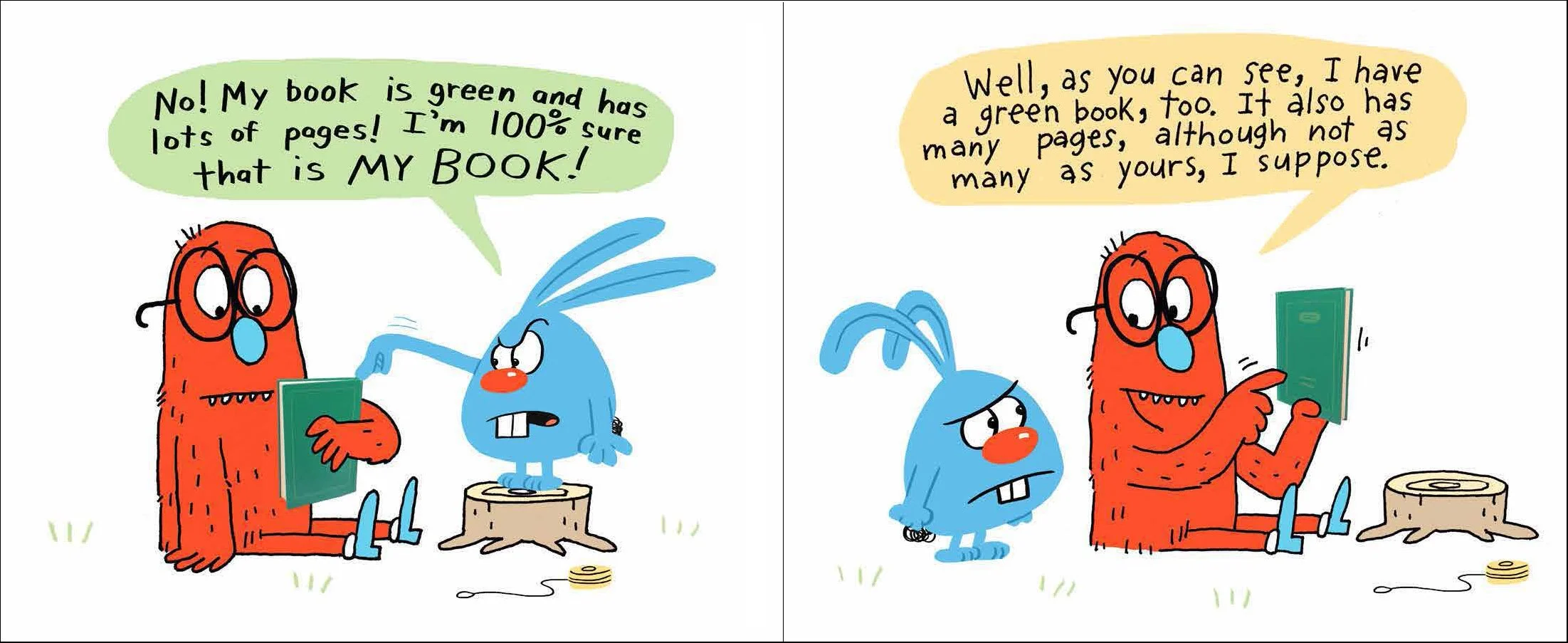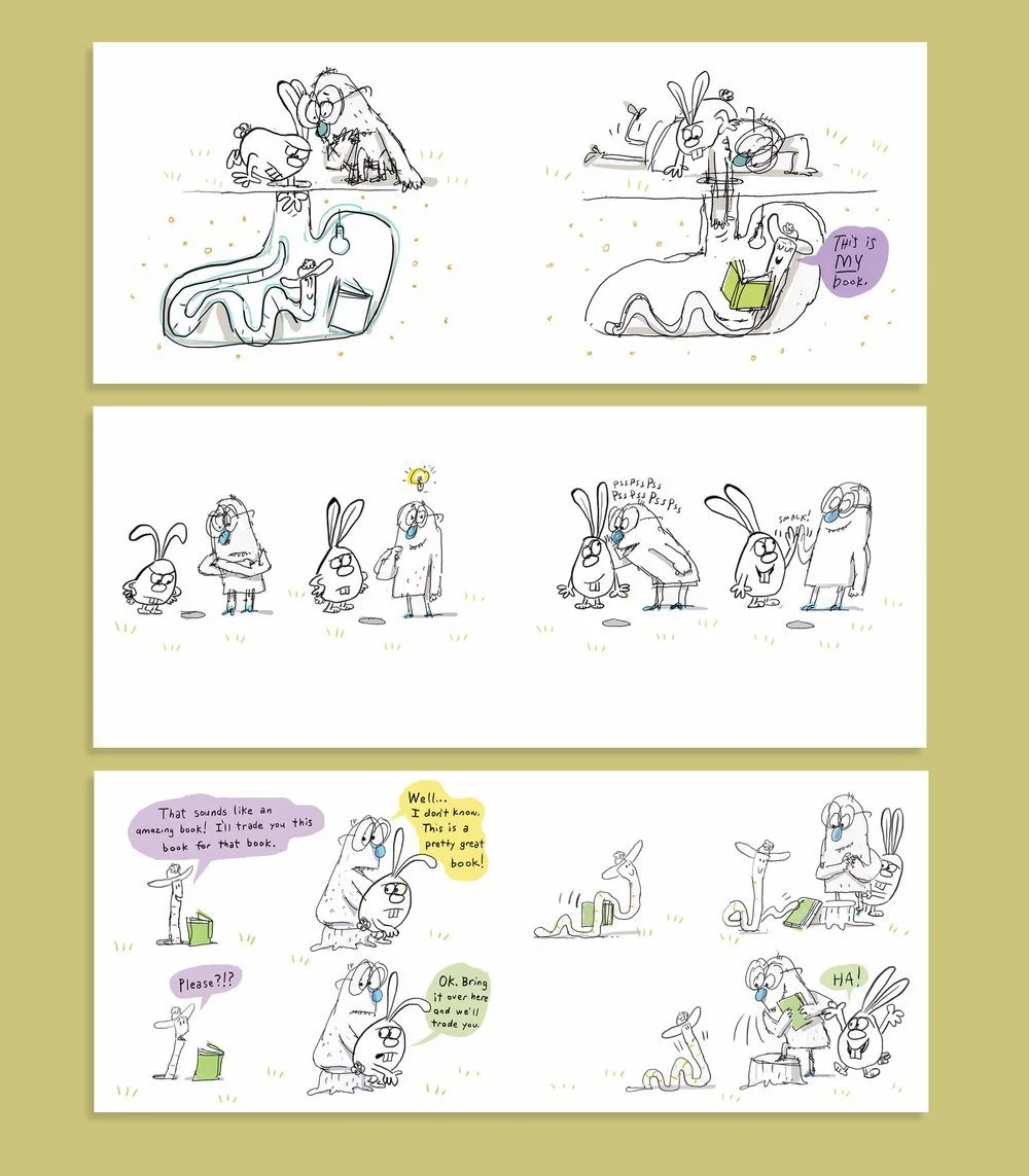 Note: The concept for this picture book was that one illustrator draw one character and another illustrator draw the other. Travis Foster drew Redd and all of his lettering/dialogue and Ethan drew Bloo and all his Dialogue/lettering. Travis also drew the Book Worm character. Ethan wrote the story and did the design. It was a true collaboration. Visit Travis at travisfoster.com.